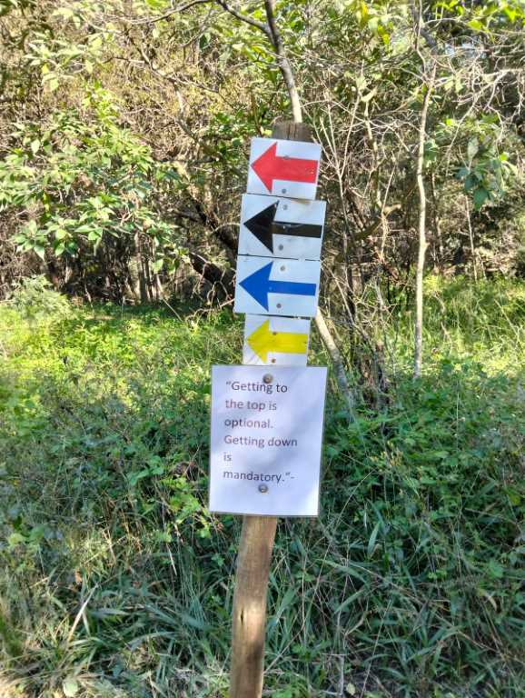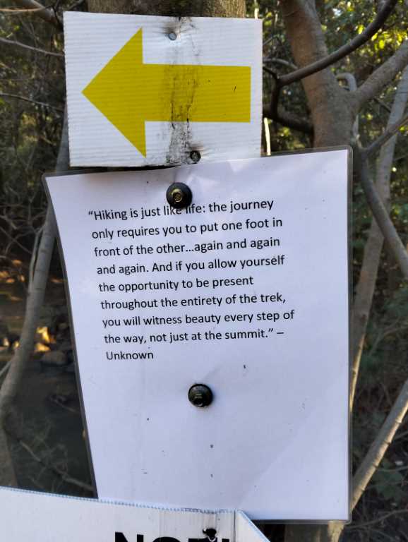 The hike starts off with a gentle meander through fields with farm gates and cattle grids, it has an immediate sense of peace, even with the sounds of the sunday bikers on Hendrik Potgieter right along side us. The direction markers are clearly denoted by colour-coded arrows and at most of the markers you get a lovely motivational quote to spark conversation and good vibes.